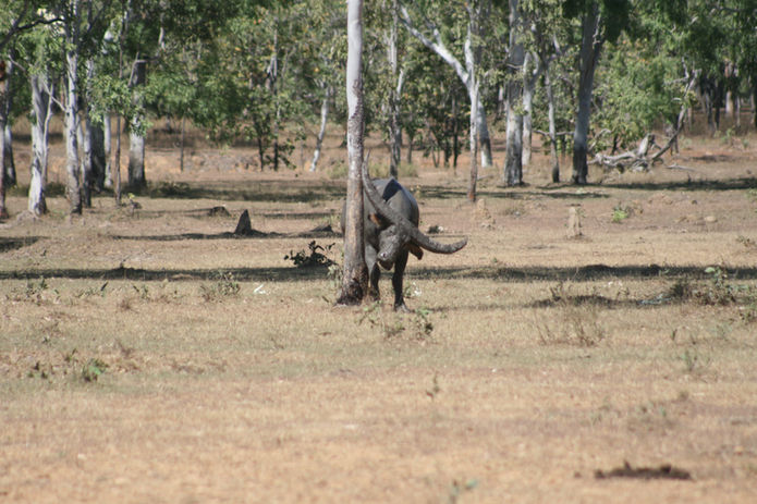 Water buffalo were imported to Australia in the 19th century to supply meat to remote northern settlements. The settlements and their buffalo were abandoned in 1949 and, despite harvesting for meat, hides and as hunters' trophies, feral buffalo spread across the northern floodplains. The Brucellosis and Tuberculosis Eradication Campaign reduced feral buffalo numbers significantly in the 1980s and 1990s but numbers are again very high right across northern Australia causing significant damage to wetlands. The buffalo like a wet habitat and graze early mornings and late evenings but spend the majority of their day times in the shade of a river bed wallow or flood plane wetlands
